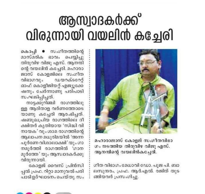 Viju S Anand attained his ‘ Ganabhooshanam’ Diploma with a meritorious first class from R.L.V College of Music, Thripunithura and he Graduated in Carnatic Music from Govt. Chittur College, Palakkad. Later on he completed his Masters in Violin (MA Music) with distinction from the Department of Music, University of Delhi.